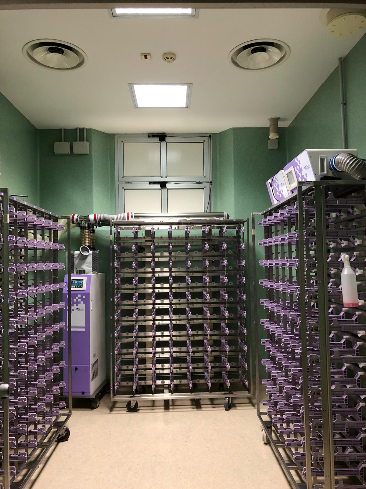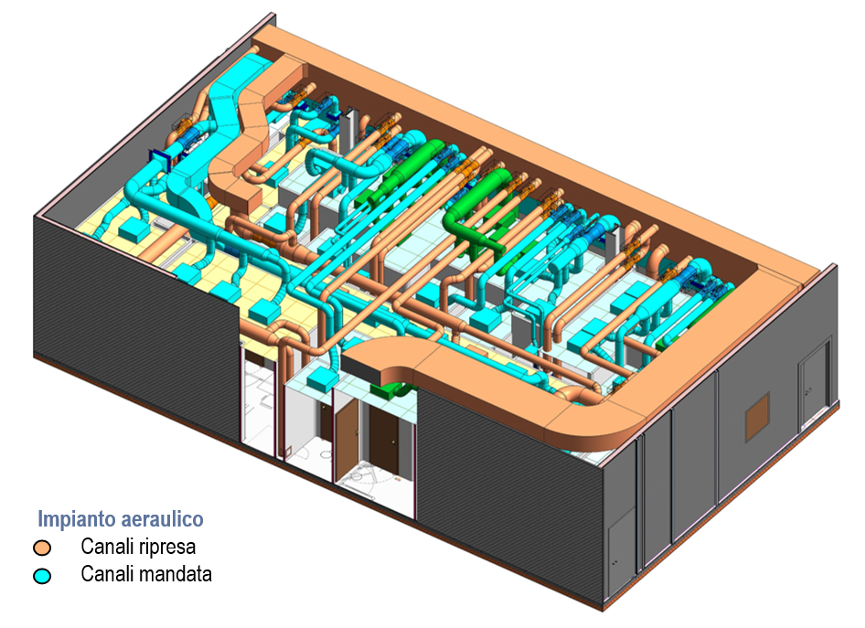 Tutti i locali delle aree laboratorio sono in sovrappressione rispetto alle zone circostanti. L’impianto aeraulico è del tipo a tutt’aria ed è munito di un sistema di regolazione dei flussi d’aria con filtri assoluti.