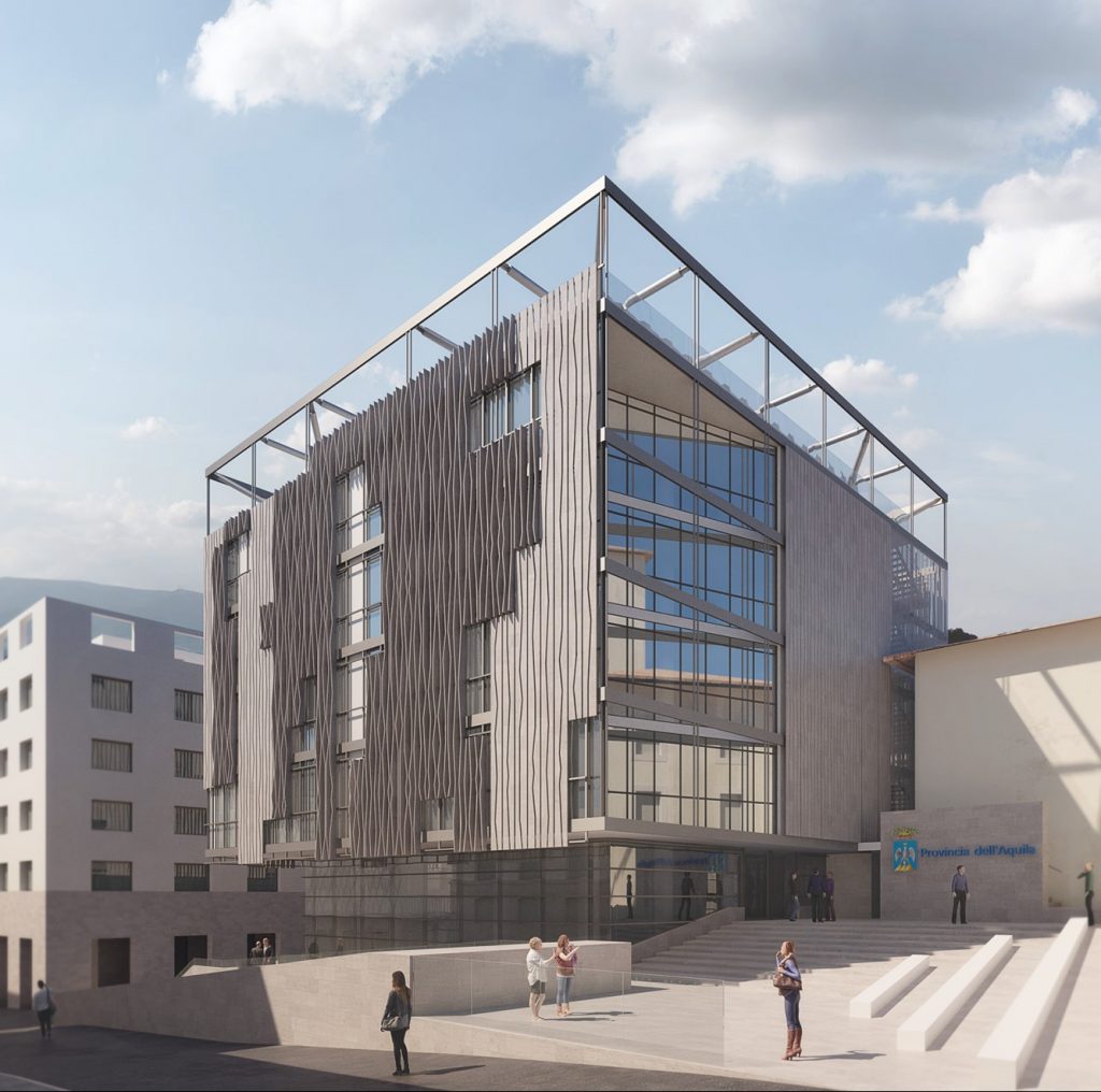 Realizzazione dell’Edificio di Sant’Agostino con un intervento sostitutivo all’interno del complesso che vede la ricostruzione del Palazzo del Governo dell’Aquila a seguito del sisma del 2009.
