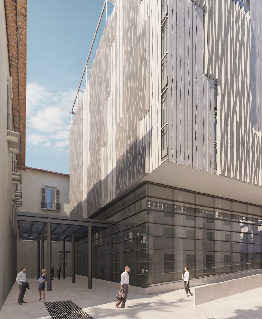 Inoltre, sono state particolarmente approfondite le tematiche architettoniche riguardanti le facciate dell’edificio, la strutturazione geometrica delle sistemazioni e l’organizzazione del verde che, in continuità con l’esistente giardino, viene riportato sino all’interrato del piano terra della hall e del podio della Sala Conferenze.